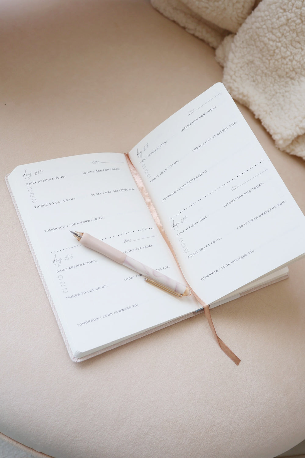 A personal journal to jot down daily affirmations, intentions and more. This journal can help you to focus on the positive aspects of life, big or small, and to cultivate a more optimistic and appreciative mindset. It can be as simple as noting down a pleasant interaction, a beautiful moment, or something you're proud of. Over time, this practice can help shift your focus from what’s lacking to what’s already good in your life, potentially improving your overall well-being and happiness.