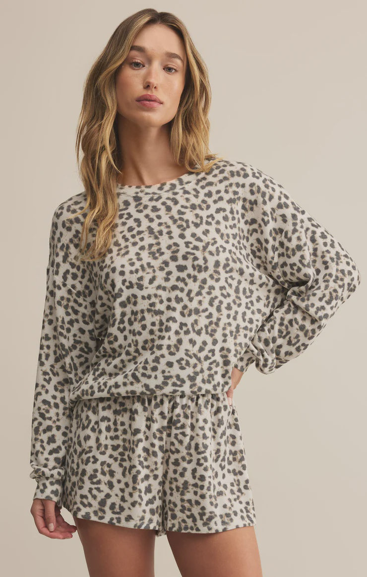 This soft brushed knit brings cozy vibes with a bold leopard twist. A classic crew neckline and relaxed shape make it perfect for lounging or layering.