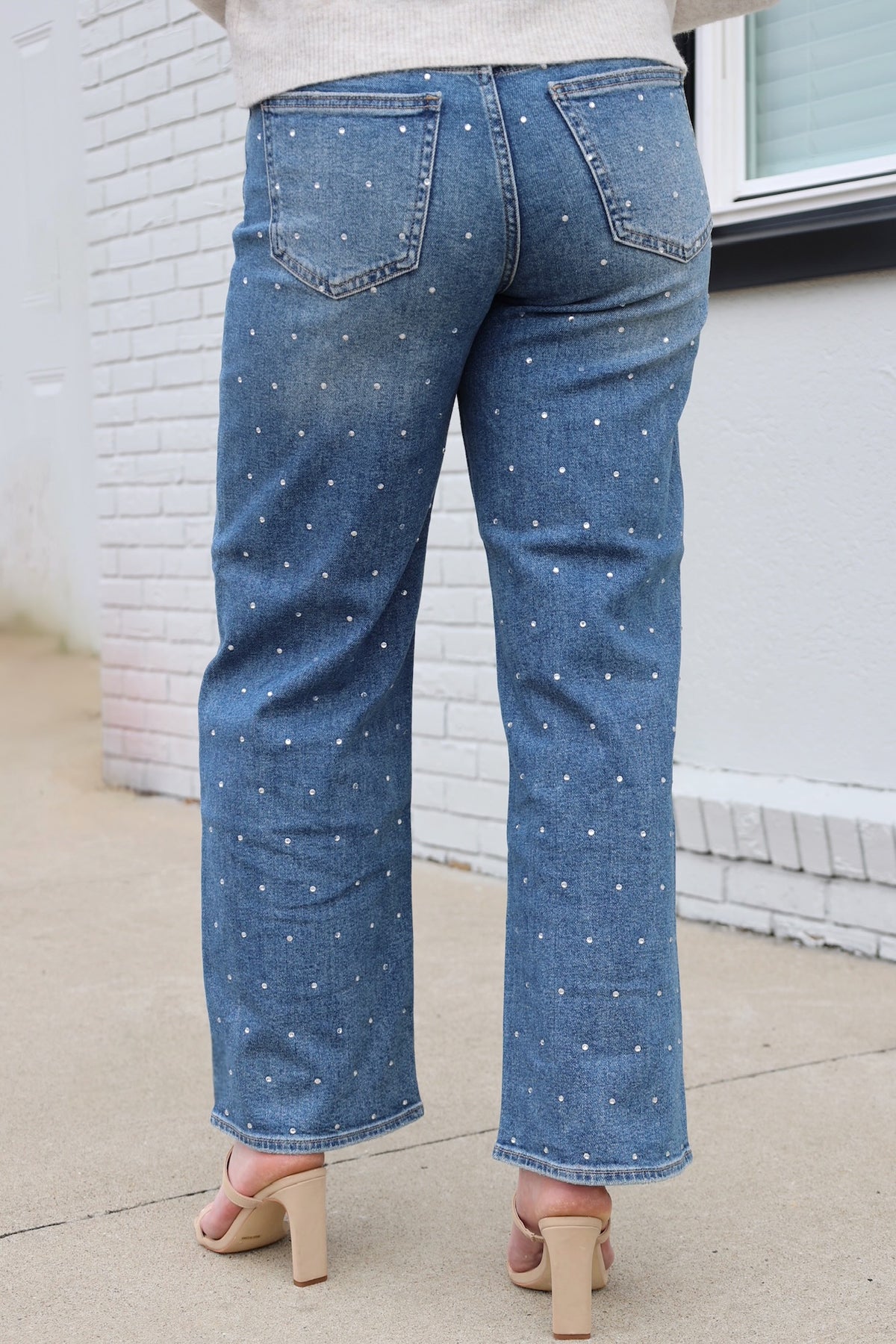 Crafted with a flattering high-rise waist, this pair features a classic straight-leg fit and a versatile medium wash that offers a lived-in, effortless vibe. Sparkling rhinestone accents are delicately scattered throughout, catching the light with every move, bringing a touch of glam to this everyday staple.