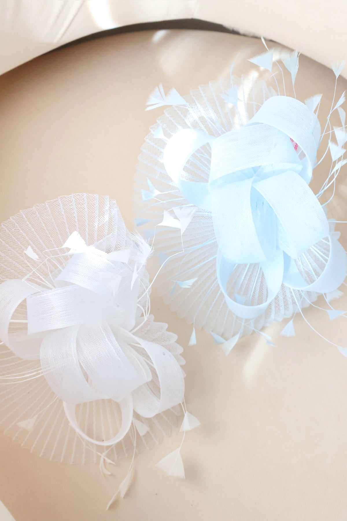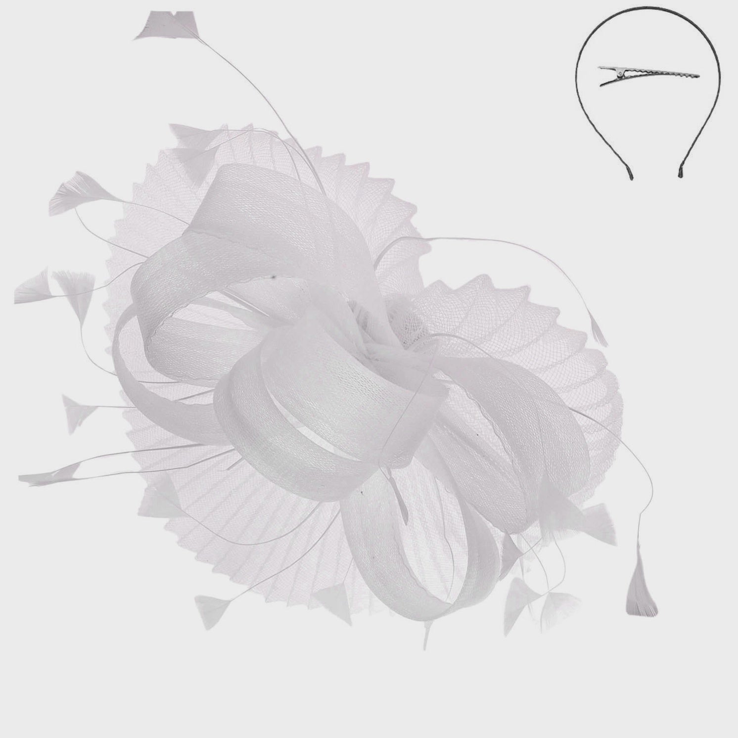• Organza mesh, feathers, and beaded detailing; clip or headband