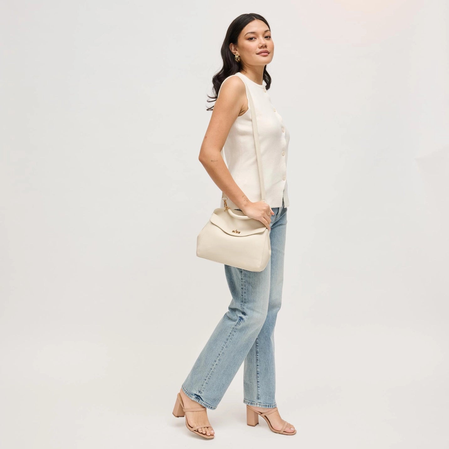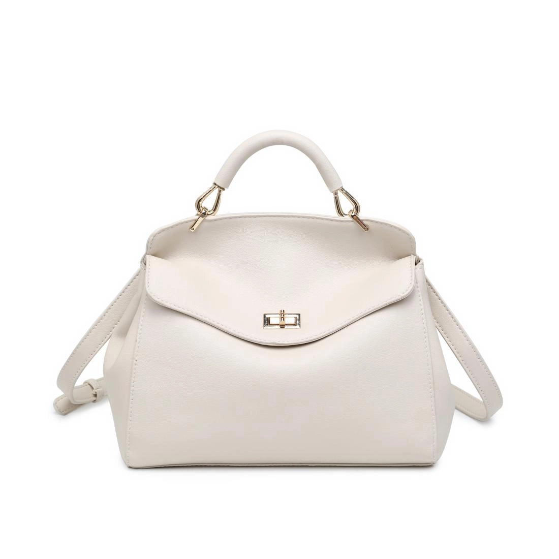 Liza Crossbody — a chic top-handle silhouette with a soft curved flap and convertible strap. A versatile crossbody bag for work-to-evening looks, made in durable vegan leather with polished gold-tone hardware, secure turn-lock closure, roomy interior and back zip pocket for essentials. Wear it as a handbag or hands-free across the body; adjustable strap and structured base keep its shape. Minimal, modern lines pair with tailored or casual outfits, offering high-style functionality at an accessible price. *Item Type: Crossbody *Material: Vegan Leather *Closure: top flap secures with a metal turn-lock clasp for quick one-handed opening and reliable fastening to keep daily essentials contained and accessible. *Exterior Details: structured silhouette with padded top handle and adjustable shoulder strap with buckle, back exterior pocket for easy reach, gold-tone hardware and stable base. *Interior Details: fabric-lined main chamber includes a zippered pocket along the inside back wall and two open slip pockets for phone, cards and small items.