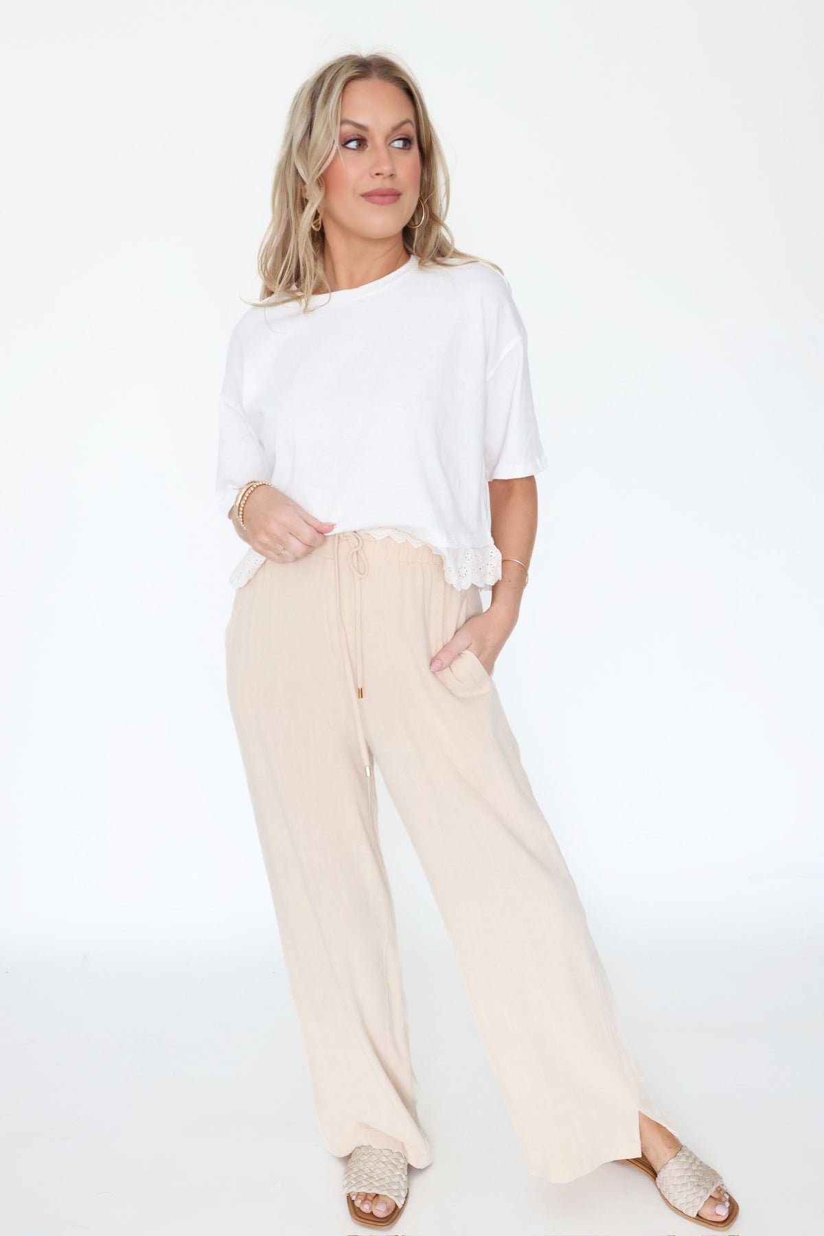 Bring a sweet and easy charm to your everyday look with this relaxed boxy top. Designed with a soft knit feel, it features dropped shoulders and a loose silhouette for effortless comfort. The standout detail is the scalloped eyelet trim at the hem adding a feminine touch that elevates the simple shape. Easy to style with denim shorts skirts or cargo bottoms this piece is perfect for warm weather layering