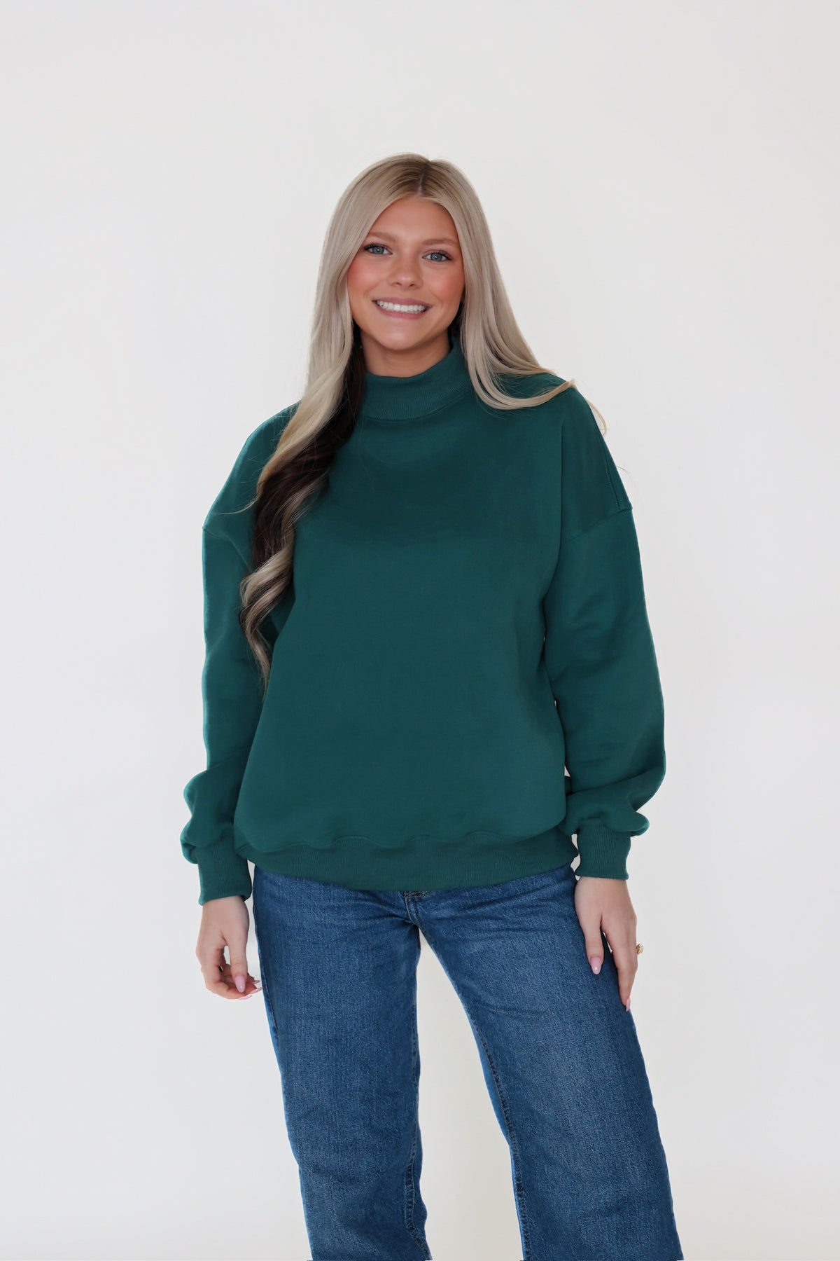 Stay effortlessly cool in this relaxed mock neck sweatshirt. Designed in a deep teal shade, it features a soft cotton-blend fabric with an oversized silhouette that drapes comfortably. The dropped shoulders and roomy fit bring a casual, laid-back vibe while the clean neckline adds a modern touch. Perfect for pairing with denim, leggings, or layered over skirts for that effortless off-duty style.