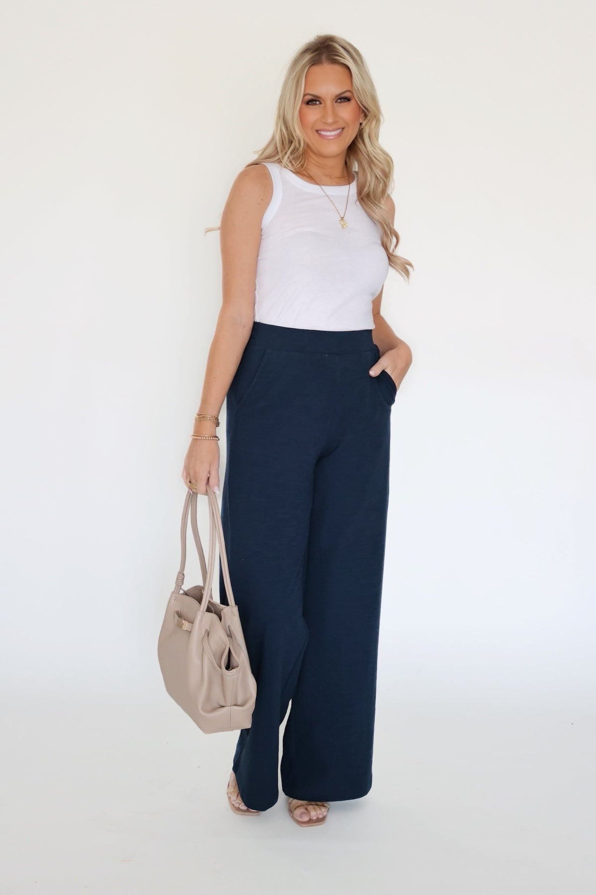 Featuring an elastic waistband, high rise fit, and side pockets, this lightweight pant moves gracefully with you. Complete the look with the Noelle Textured Tank Top.