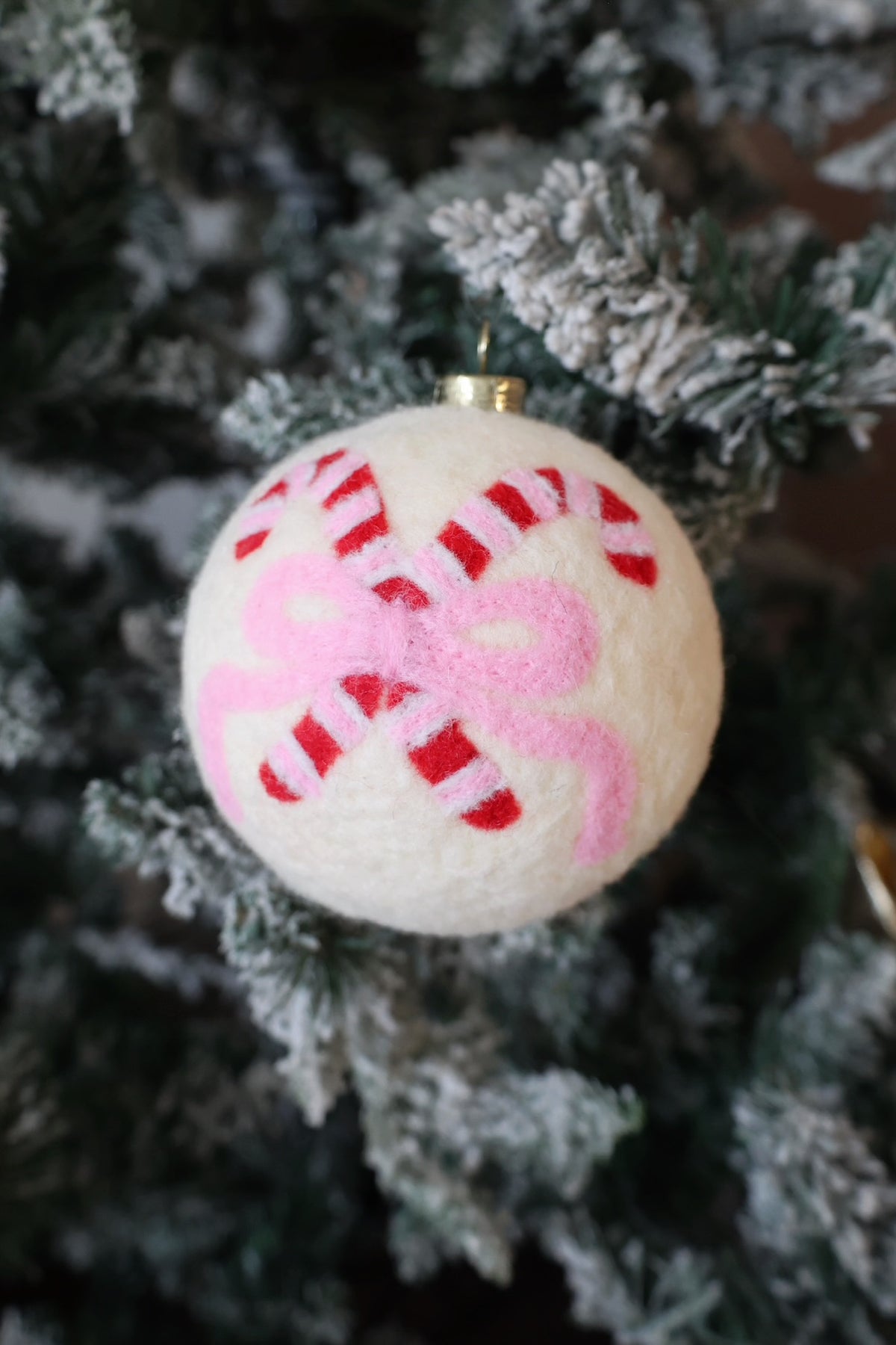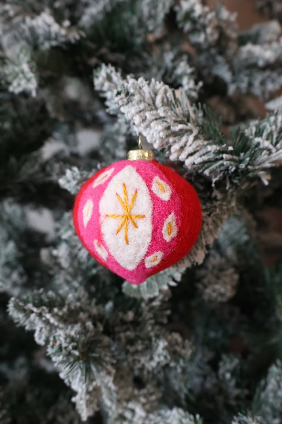 Measures Medium: D 4"; Large: D 5"Made from polyester, wool, and polystyrene, Deck the halls (and your tree) with our "Ho Ho Ho" Assorted Set of 4 Ornaments. This vibrant set includes a jolly mix of shapes and designs, featuring a playful nutcracker, retro-style baubles, and a cheerful “Ho Ho Ho” ornament. Made from soft, hand-felted wool with bold colors and charming details, these ornaments add a touch of nostalgic whimsy to your holiday décor. Each piece is lightweight yet eye-catching—perfect for trees big or small.