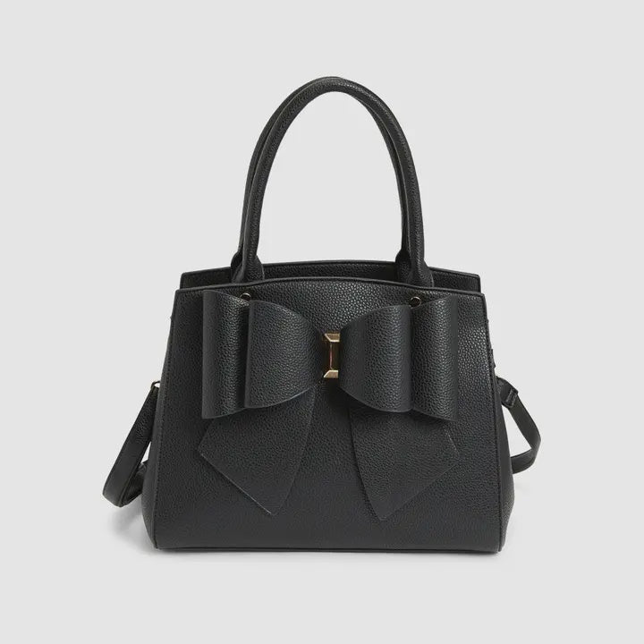 Mid-size three compartment satchel with signature double bowtie ornament. Includes top handle and adjustable/detachable strap for multiple wearing options. Composed of premium vegan leather. Two inner compartments divided by a zipper pouch, and a zipper and slit pocket on the inner surface. Fits large items like laptops and tablets, to smaller daily essentials like headbands, hair clips, and sunglasses for Spring. * Composition: Vegan Leather * Dimensions: 12"W x 9"H x 6"D * Top handle drop: 6 1/4" * 1 zipper closure + 2 zipper pockets 1 slit * Adjustable/detachable long strap