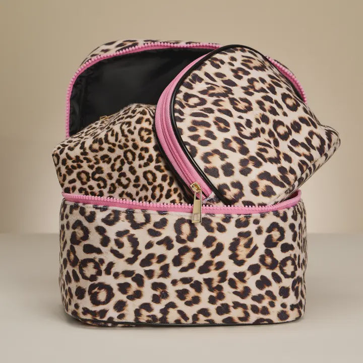 Keep your beauty essentials organized with this leopard print travel makeup bag, designed for both style and function. Made from a 90% polyester and 10% nylon blend, the fabric is lightweight and smooth to the touch. The bag features a secure pink zipper closure, a padded handle for easy carrying, and a spacious interior to store makeup, skincare, or toiletries. Perfect for daily use or travel. approx. size. 9'x4'x5' in