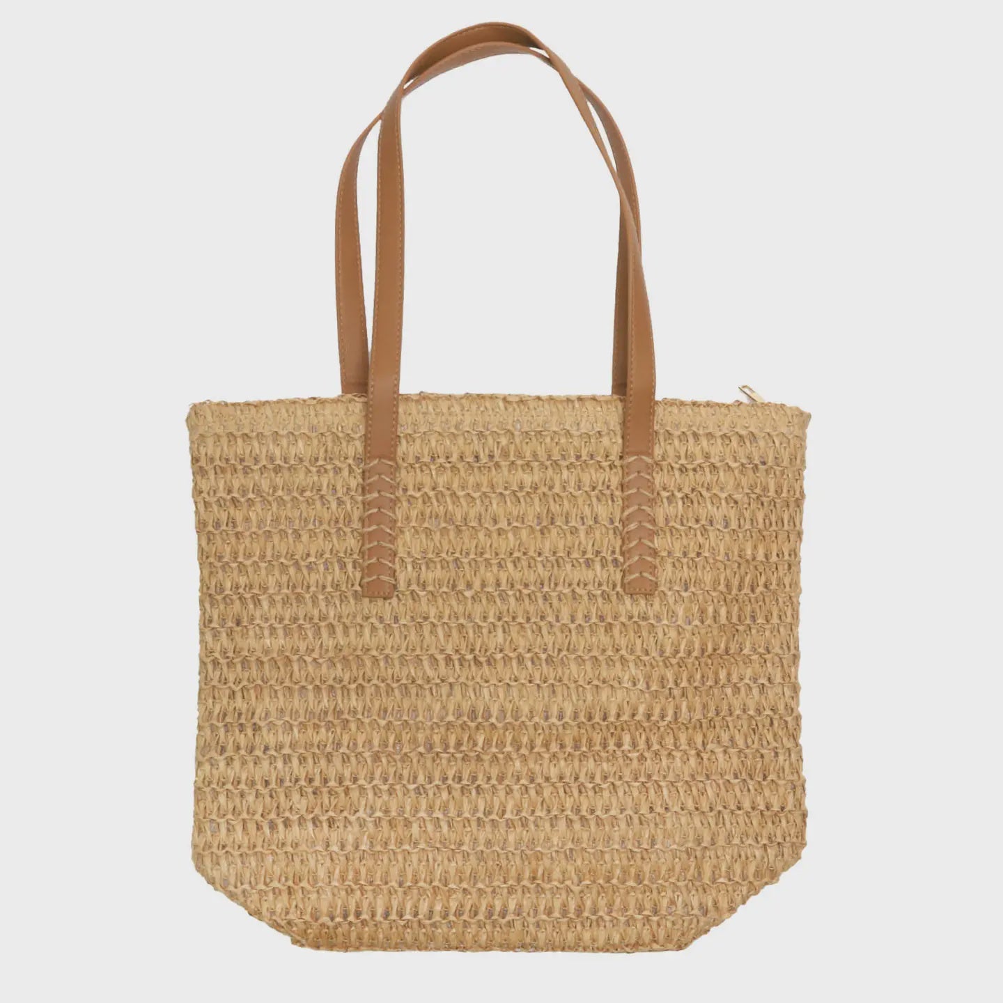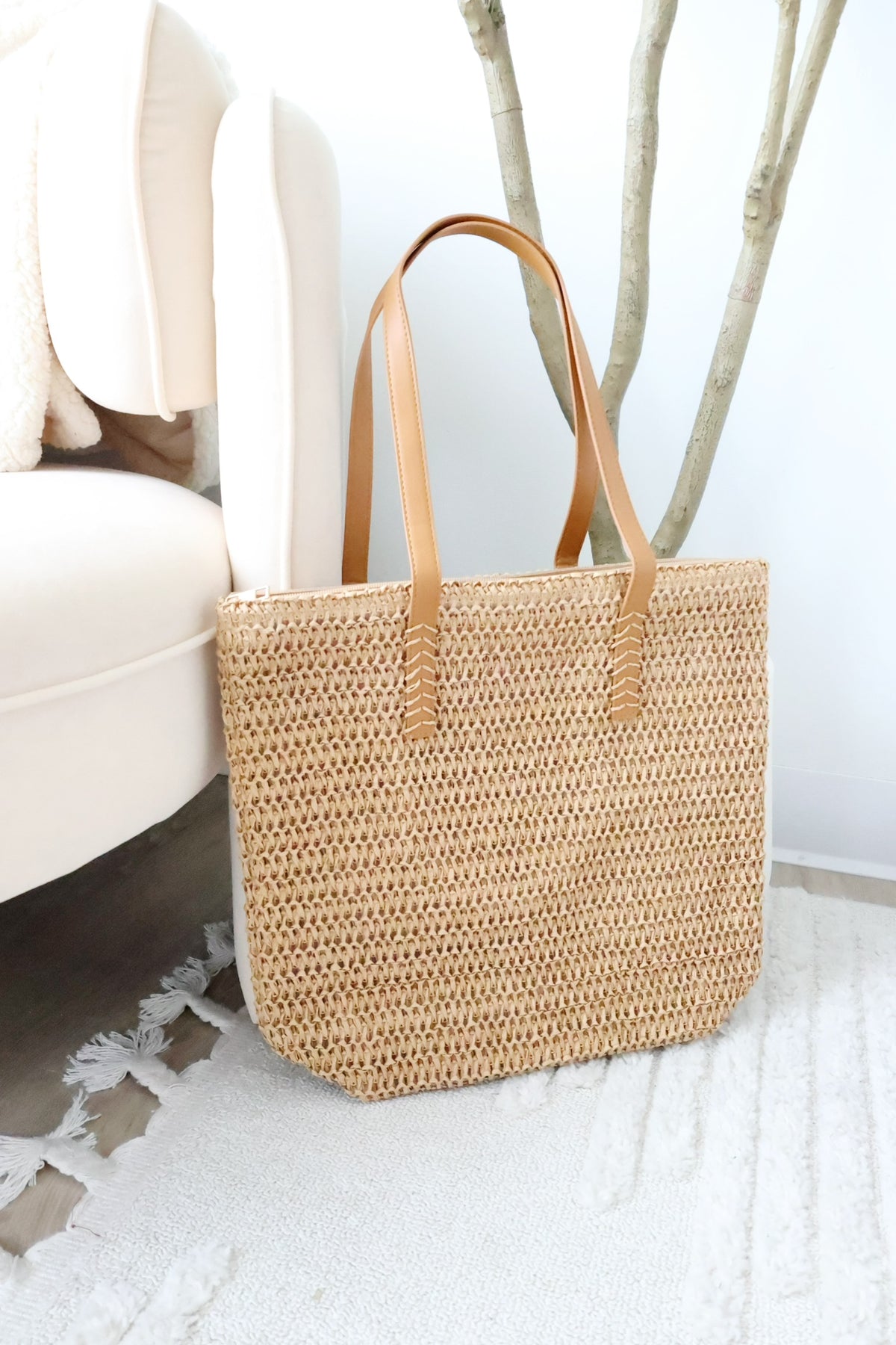 Woven straw shoulder tote with faux leather handles and full zipper closure