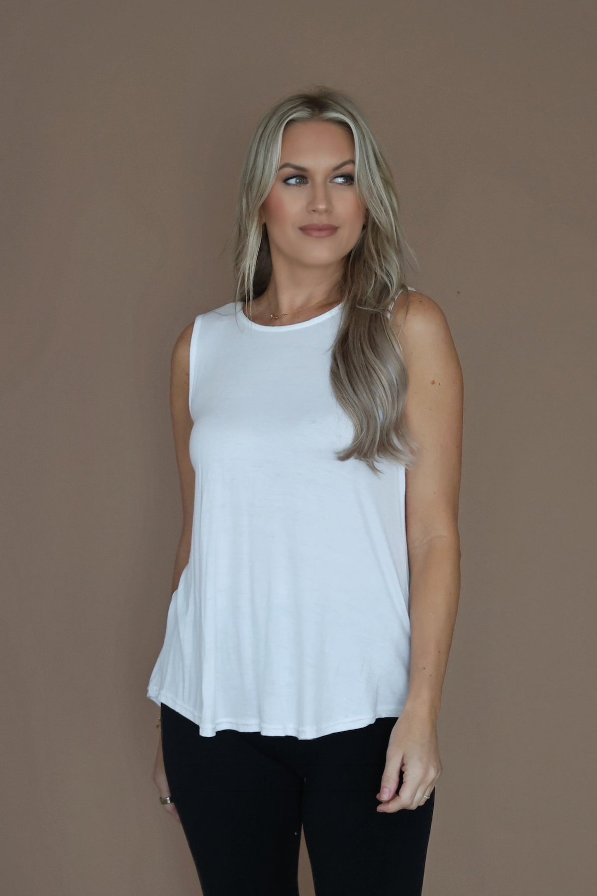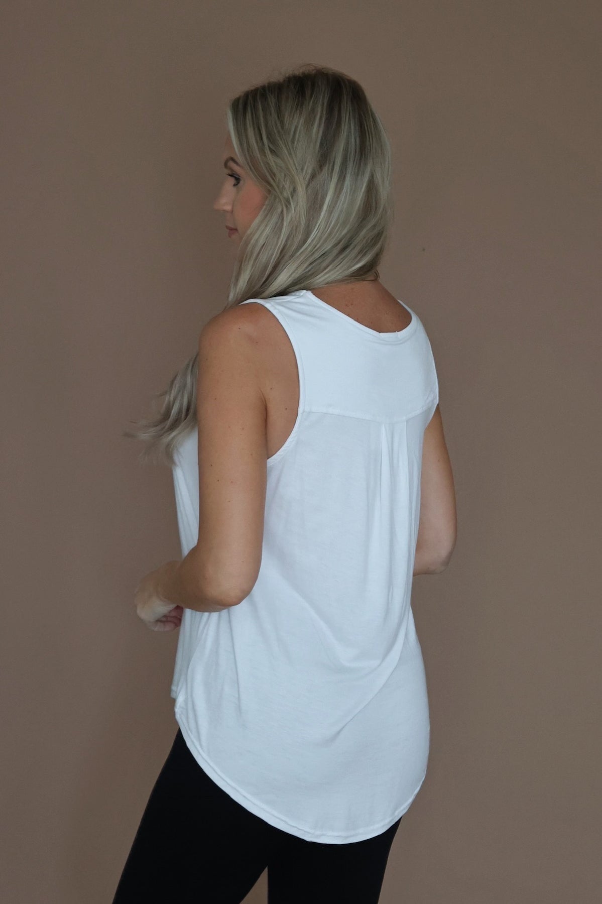 • Curved hem and back pleat detail, brings ease and elegance to our sleeveless Erin Pleat Tank.