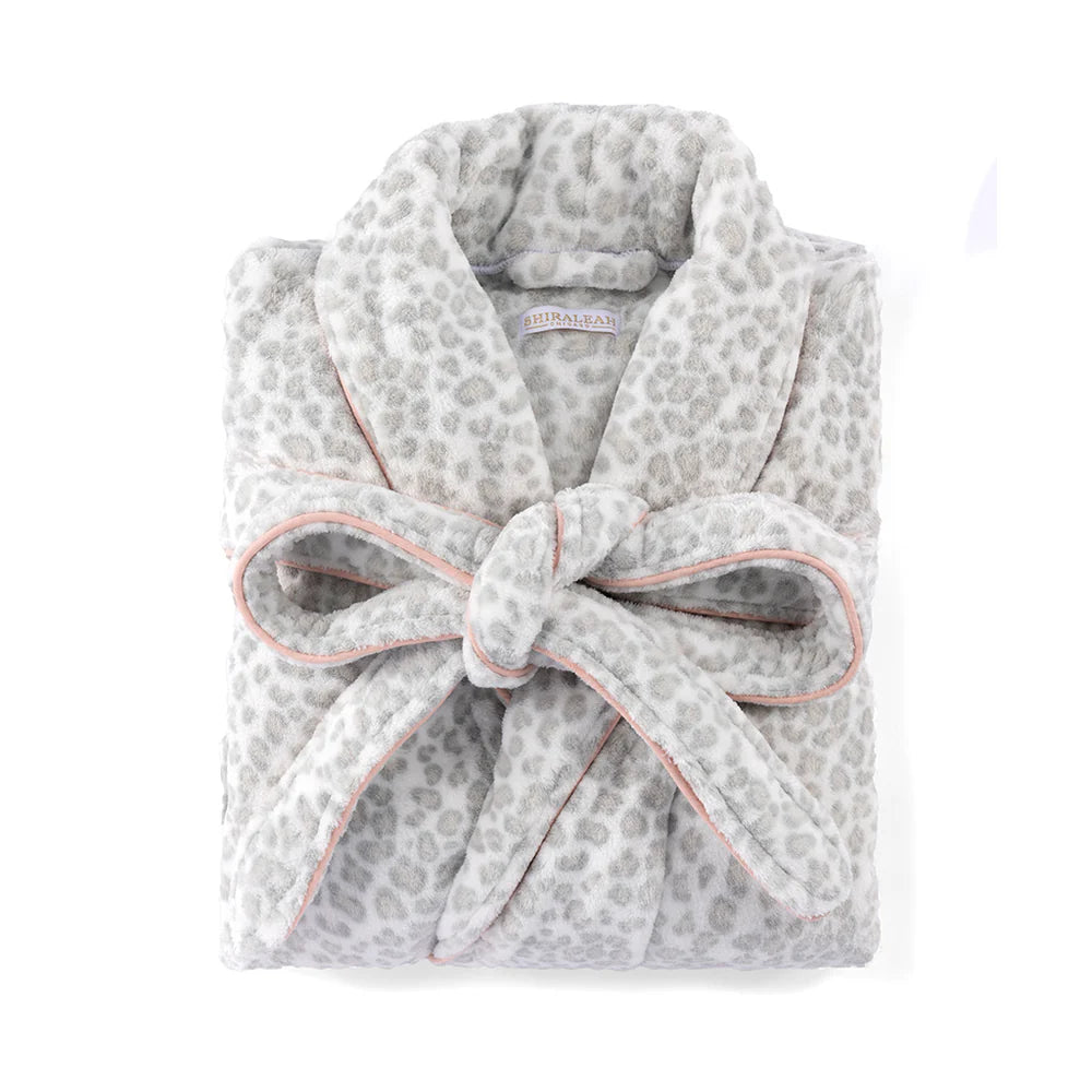 Add a comfortable yet luxe touch to your sleepwear with Shiraleah’s Lelo Robe. This robe features a soft grey and white leopard print and a pink piping detail giving it a extra feminine touch. It also has a wrap around belt and two front pockets. Made from polyester, this cozy robe will provide a smooth and warm touch against your skin. Pair with other items from Shiraleah to complete your night time solace.