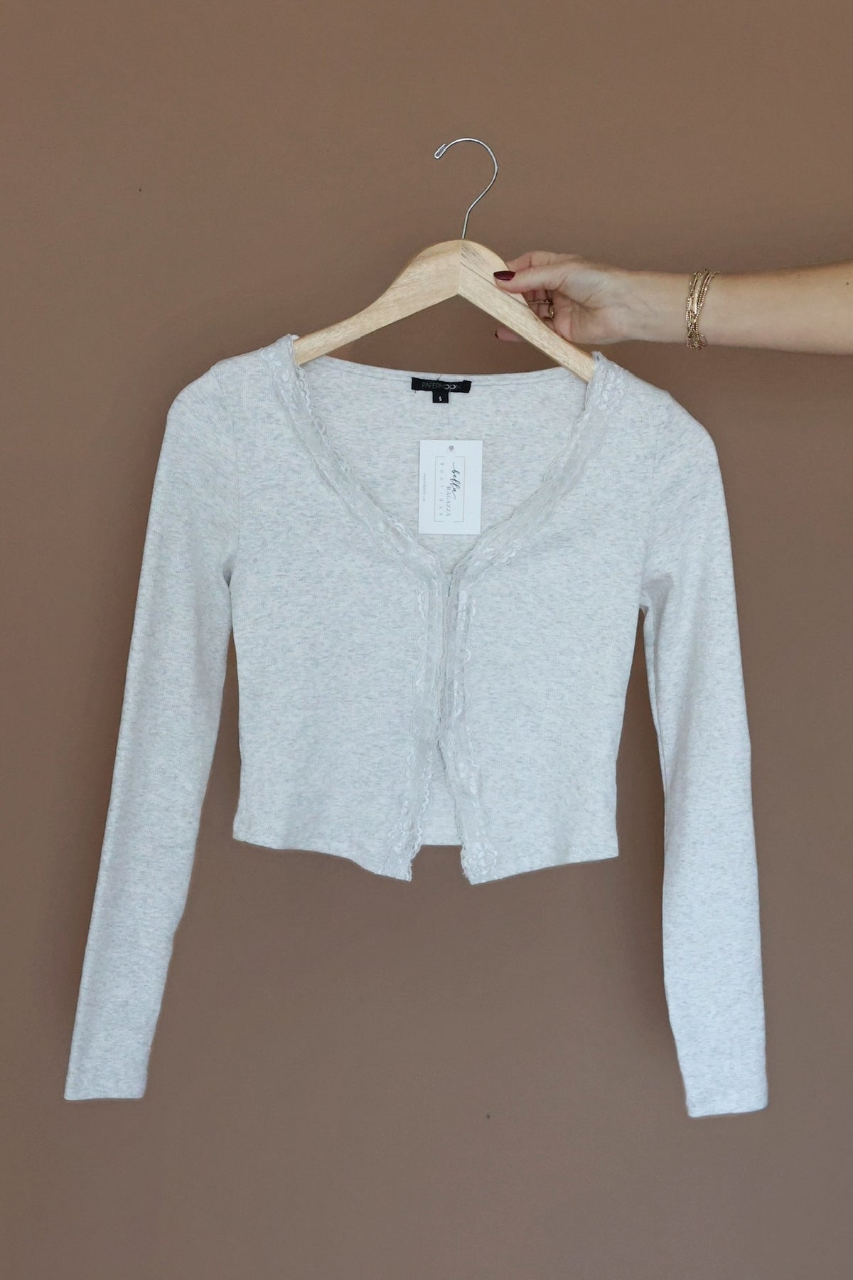 Lace-Trim Top Effortlessly chic ribbed knit cardigan featuring delicate lace trim and tie-front closure. This versatile piece transitions seamlessly from casual to dressed-up looks. Key Features: - Soft, stretchy ribbed knit fabric - Romantic lace edging detail - Adjustable tie-front closure - Cropped silhouette for flattering proportions - Perfect layering piece Styling Options: Pair with high-waisted jeans for casual elegance Layer over dresses for added coverage Perfect for transitional weather Available in neutral tones to match any wardrobe Comfortable, feminine, and endlessly versatile - your new go-to layering essential.