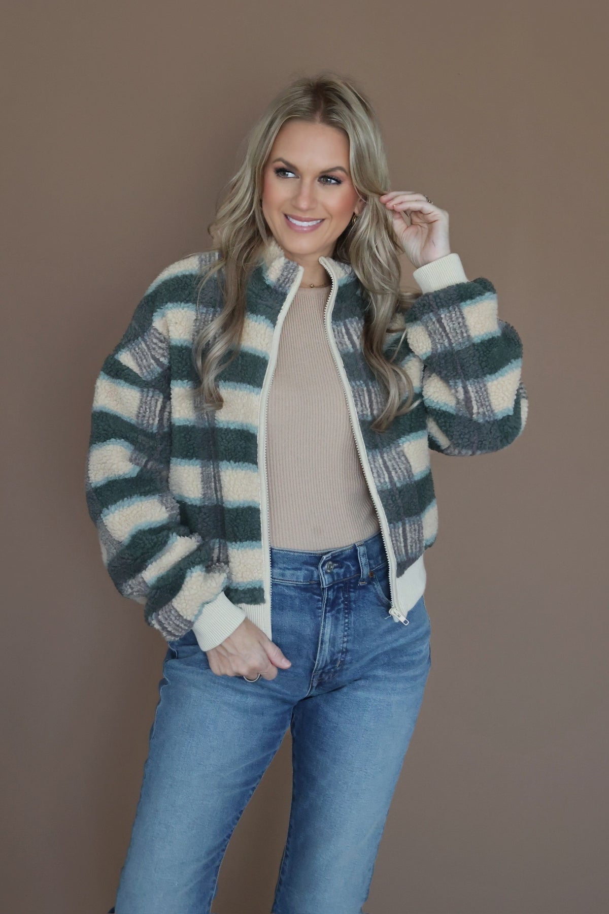 A cream plaid sherpa jacked combines cozy comfort with classic style,